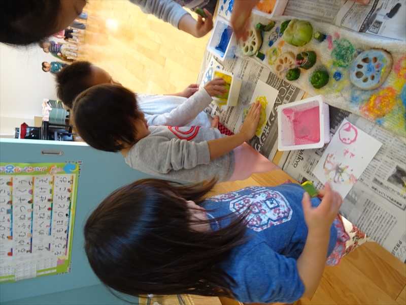 野菜スタンプ「上手に押せるかな?」