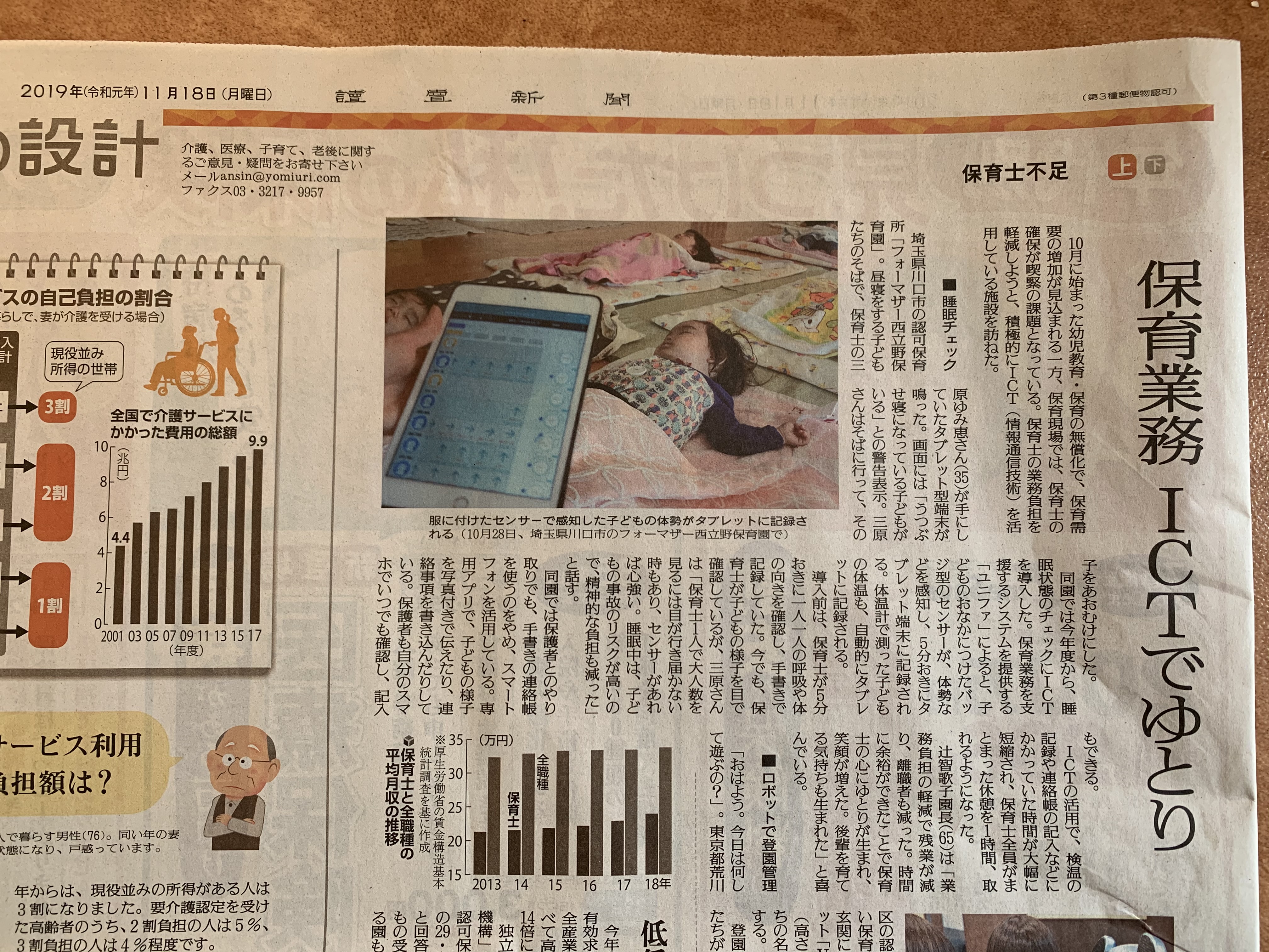 現在当園で取り組んでいるIoT、AI等を活用した「スマート保育園」について、読売新聞の取材を受け、今朝(2019/11/18)の朝刊に掲載されました!